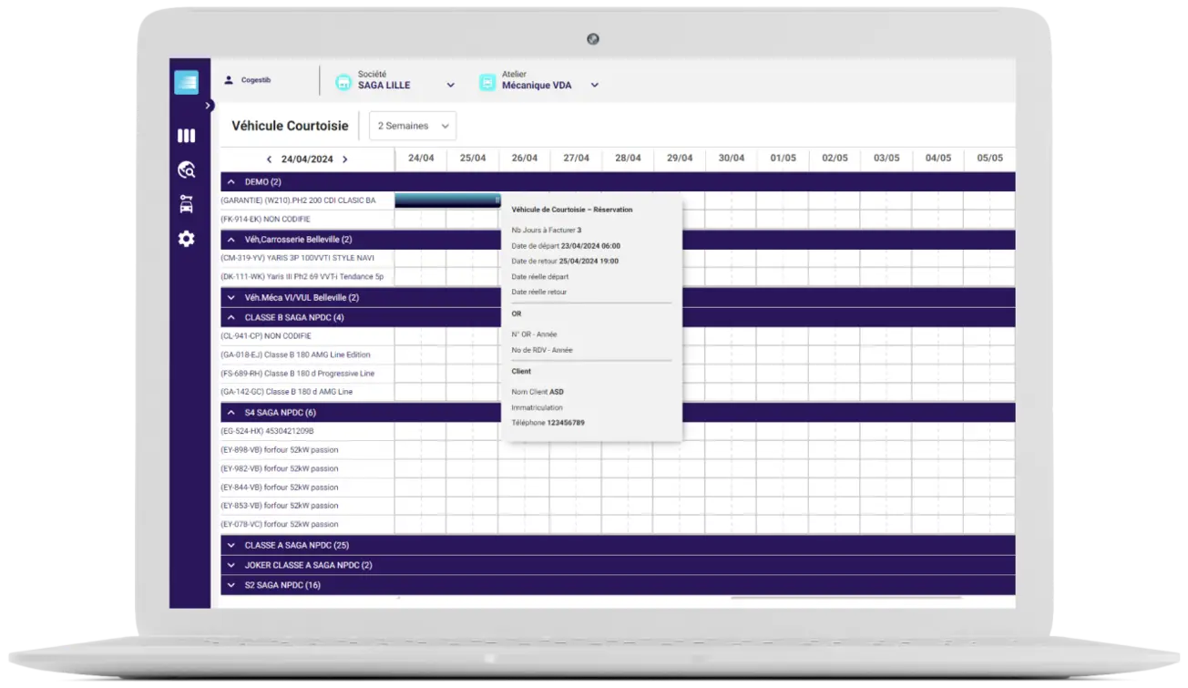 Courtesy car management is a crucial feature that enables workshops to offer better customer service. This tool allows for the control of replacement car assignments and availability.
